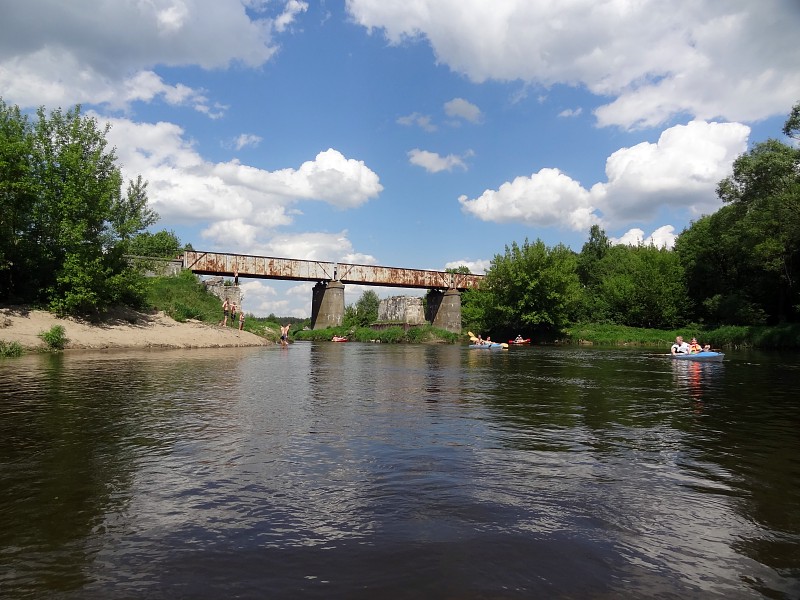 Przed nami żelazno-drewniana kładka dla pieszych oraz pod kładką kamienisty próg po dawnym młynie. Płyniemy przy prawym przęśle kładki ustawiając kajak równolegle do nurtu rzeki. Za kładką po prawej stronie szeroka, piaszczysta plaża na której można trochę poleniuchować. Bardzo dobre miejsce na zakończenie lub rozpoczęcie spływu.